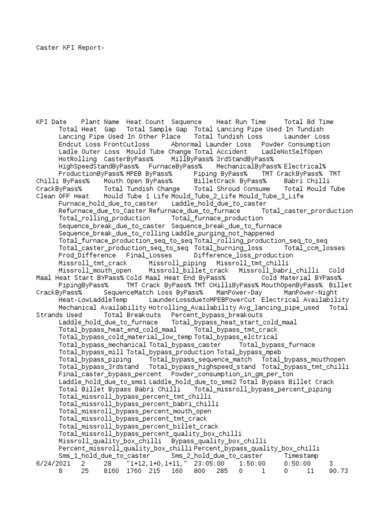 KPI Date Plant Name Heat Count Sequence Heat Run Time Total Bd Time