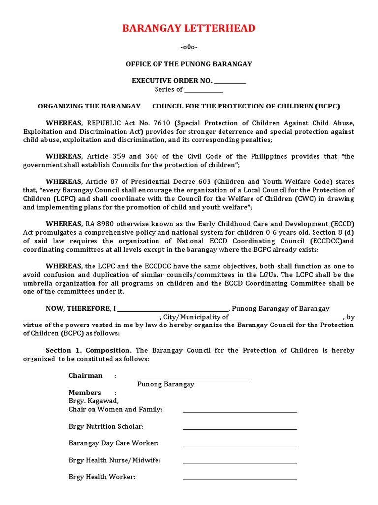 Section 1. Composition. The Barangay Council for the Protection of Children is hereby