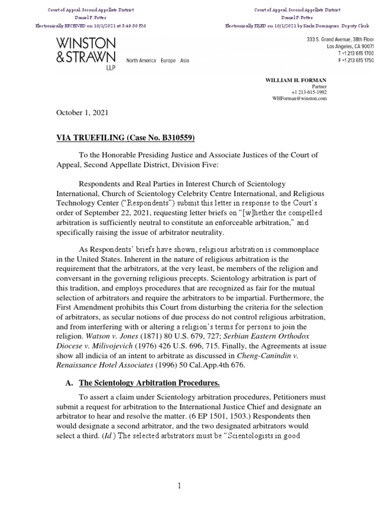 that they were forever waiving their recourse to civil courts in their dealings with Respondents. (6 EP 1501; 7 DEO 1642 ¶¶ 6.a., c.) Scientology arbitrators, as a matter of religious doctrine acknowledged by the
