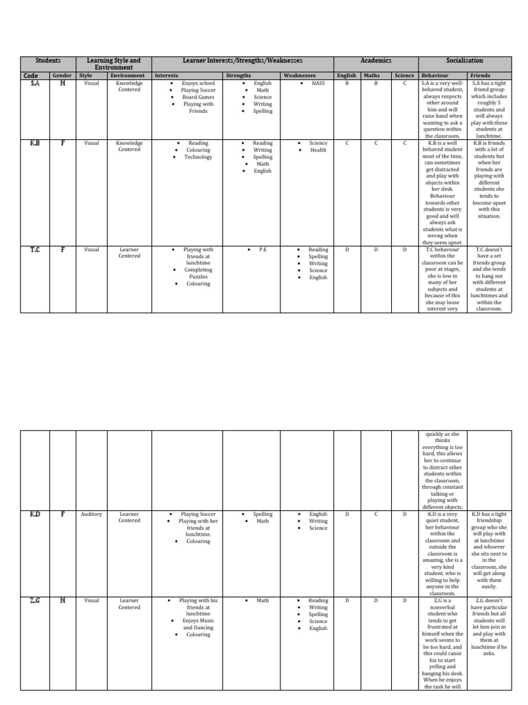 Students Learning Style and Learner Interests/Strengths/Weaknesses Academics Socialisation