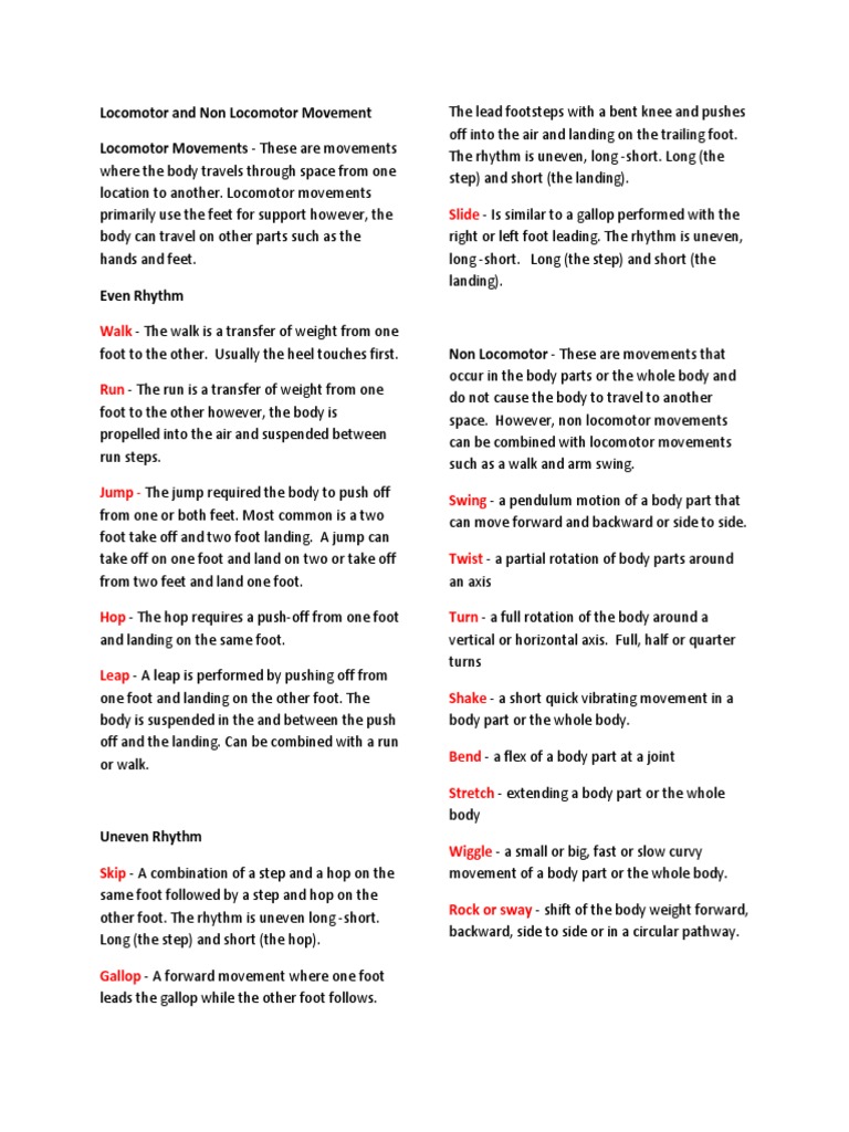 foot to the other. Usually the heel touches first. Non Locomotor - These are movements that