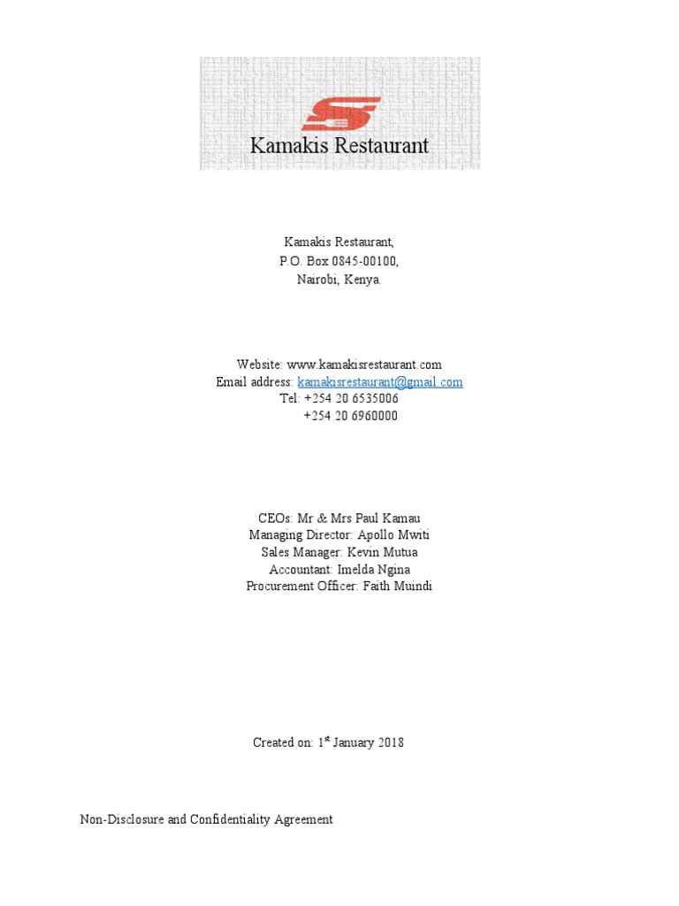 Kamakis Restaurant NDA Overview
