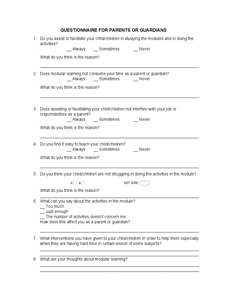 QUESTIONNAIRE FOR PARENTS OR GUARDIANS