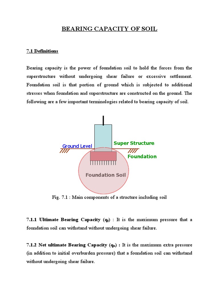 7.1.3 Safe Bearing Capacity (qs) : It is the safe extra load the foundation soil is