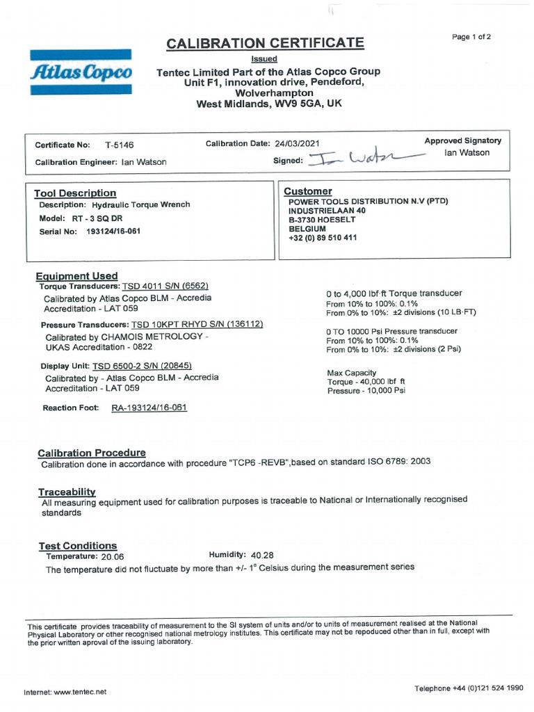 Calibration done in accordance with procedure "TCP6 -REVB" based on standard ISO 6789: 2003