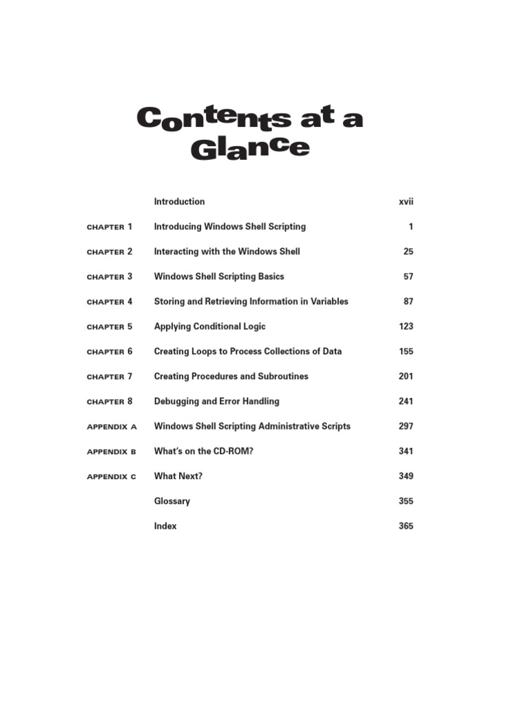 This document provides a table of contents for a book on Windows shell scripting. The table of contents lists 8 chapters that cover topics such as interacting with the Windows shell, variables, conditional logic, loops, procedures, debugging, and administrative scripts. It also includes 3 appendix sections that discuss additional topics and what is included on the accompanying CD-ROM.