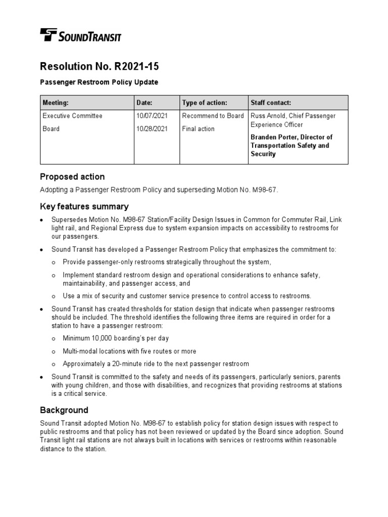 On April 25, 2019, the Board passed Motion No. M2019-31 which directed Sound Transit to look for opportunities to increase access to public restrooms at future light rail stations or updates to Motion No. M98-67 by October 1, 2019. The Board is specifically interested in understanding low and no-cost opportunities to ensure access to public restrooms at future light rail stations, including increasing wayfinding to nearby restrooms, requiring leased retail facilities to provide access, and providing on-site restrooms. The Board asked that the report should include the following: 1. Evaluation of criteria established by Motion No. M98-67 including suggestions for actions to expand access to public restrooms at future light rail stations. Expanded access to evaluate includes: a. Prominent wayfinding to note location(s) of restrooms, either inside paid station area or outside of paid station area; and b. Allowing re-entry without additional payment if riders must leave paid area to access restrooms 2. Budget and proposed implementation plan for staff recommended changes. On February 4, 2021, Safety and the Passenger Experience Departments presented to the Rider Experience and Operations Committee on the following topics: