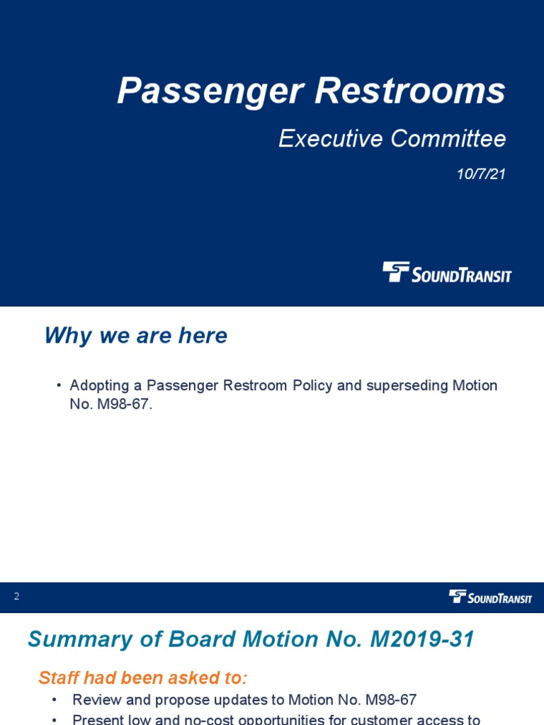 •Review and propose updates to Motion No. M98-67•Present low and no-cost opportunities for customer access to restrooms at future light rail stations•Evaluate and recommend opportunities including wayfinding, requiring leased retail spaces to provide access, and on-site restrooms•Provide suggestions for Board actions to expand restroom access•Consider budget and proposed implementation plan