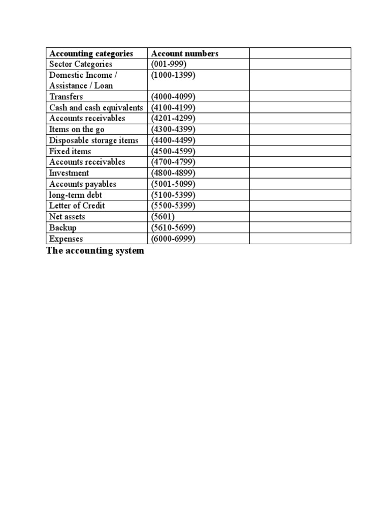 Accounting categories Account numbers