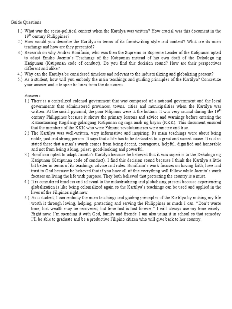 1.) What was the socio-political context when the Kartilya was written? How crucial was this document in the