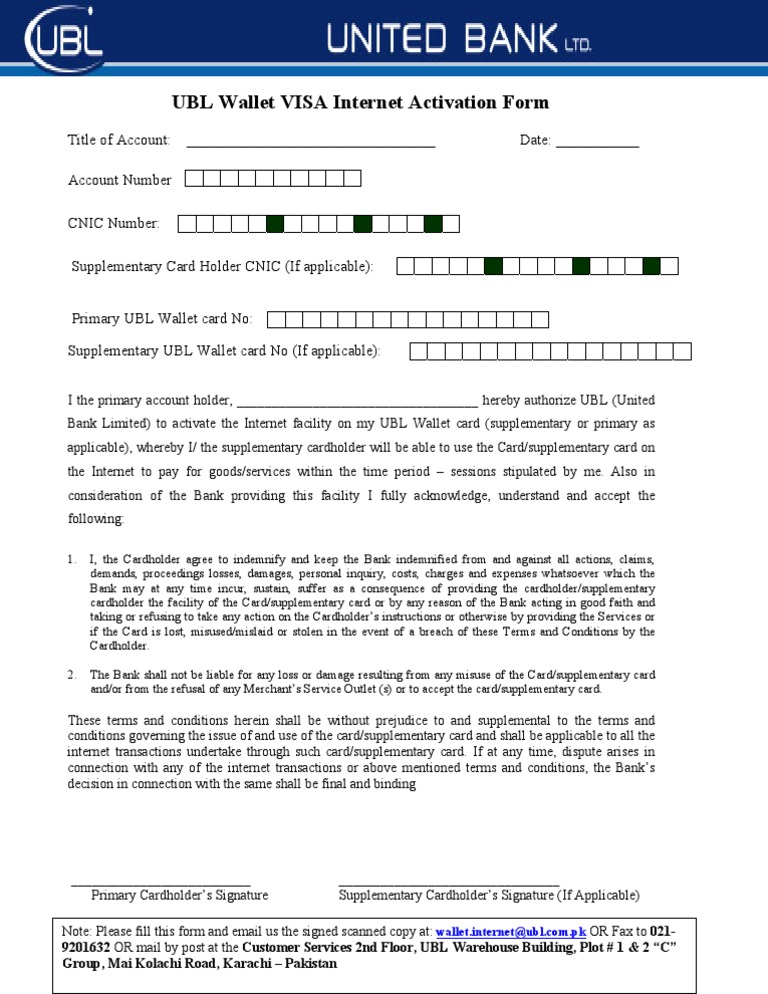 Bank Limited) to activate the Internet facility on my UBL Wallet card (supplementary or primary as