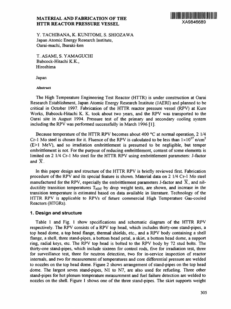 critical in October 1997. Fabrication of the HTTR reactor pressure vessel (RPV) at Kure