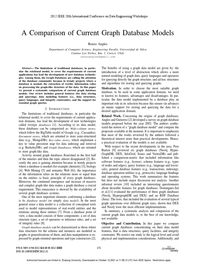 tion domains, has lead the development of new technologies Angles and Gutierrez [2] developed a survey on graph database