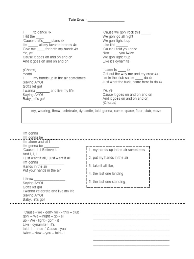 my, wearing, throw, celebrate, dynamite, told, gonna, came, space, floor, club, move