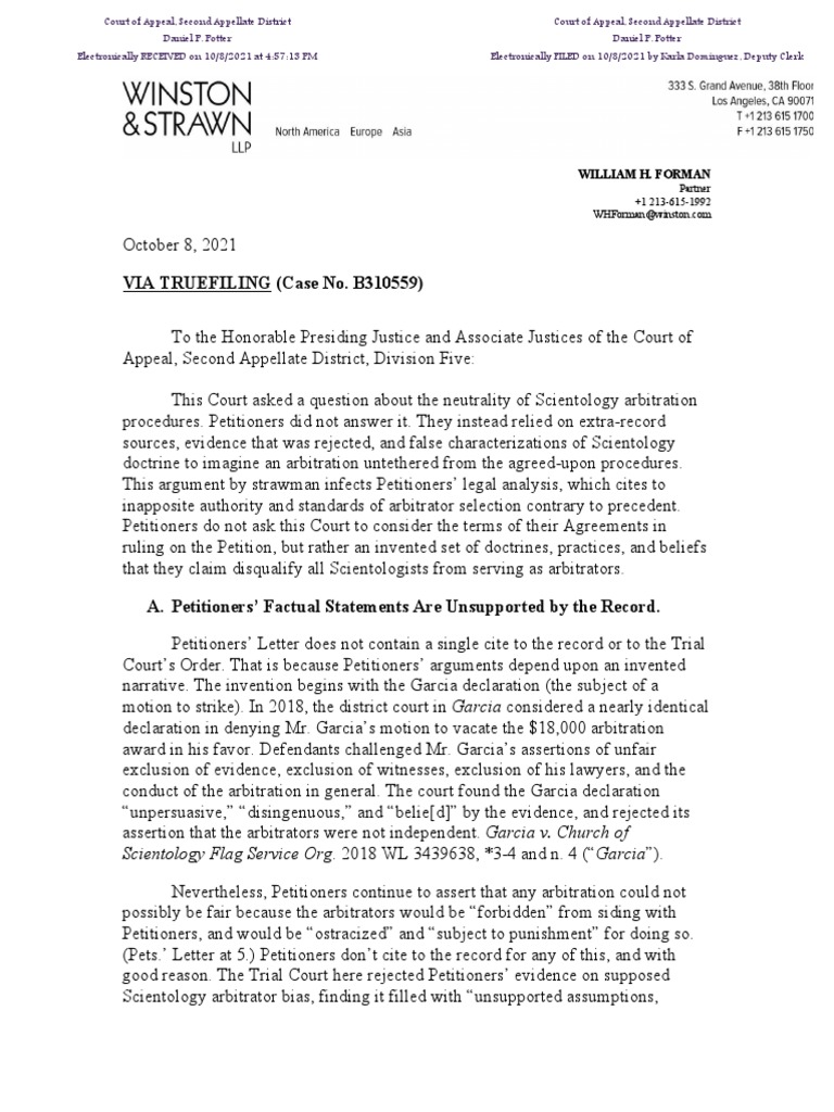 To the Honorable Presiding Justice and Associate Justices of the Court of Appeal, Second Appellate District, Division Five: This Court asked a question about the neutrality of Scientology arbitration procedures. Petitioners did not answer it. They instead relied on extra-record sources, evidence that was rejected, and false characterizations of Scientology doctrine to imagine an arbitration untethered from the agreed-upon procedures. This argument by strawman infects Petitioners’ legal analysis, which cites to inapposite authority and standards of arbitrator selection contrary to precedent. Petitioners do not ask this Court to consider the terms of their Agreements in ruling on the Petition, but rather an invented set of doctrines, practices, and beliefs that they claim disqualify all Scientologists from serving as arbitrators.