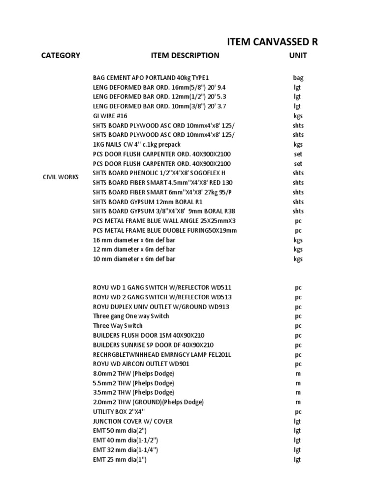 CATEGORY ITEM DESCRIPTION UNIT