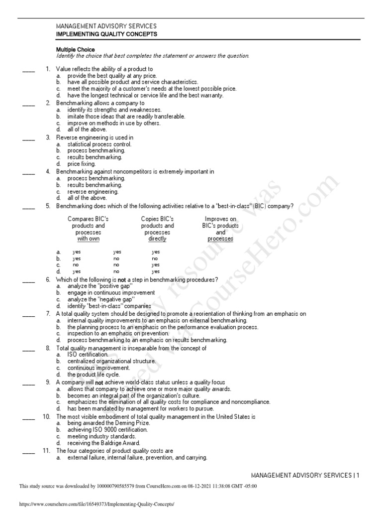 ____ 5. Benchmarking does which of the following activities relative to a "best-in-class" (BIC) company?