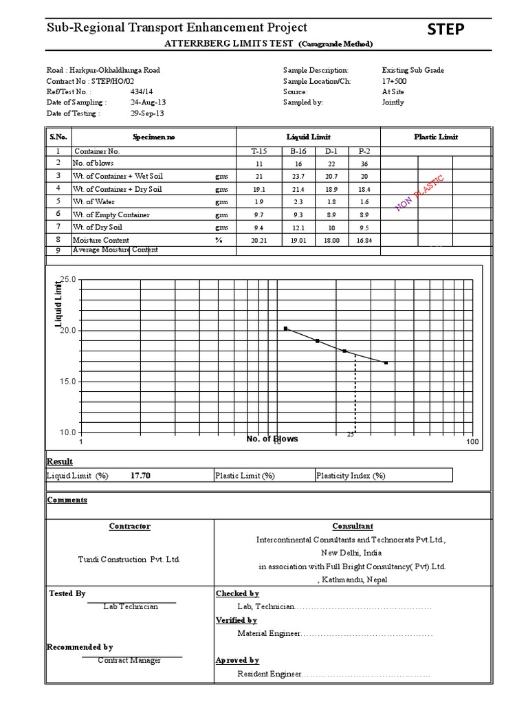 Liquid Limit (%) 17.70 Plastic Limit (%) 0.00 Plasticity Index (%) 17.70