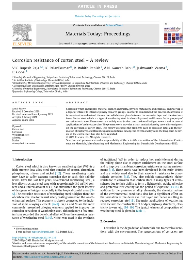 Please cite this article as: V.K. Bupesh Raja, K. Palanikumar, R. Rohith Renish et al., Corrosion resistance of corten steel – A review, Materials Today: Pro-