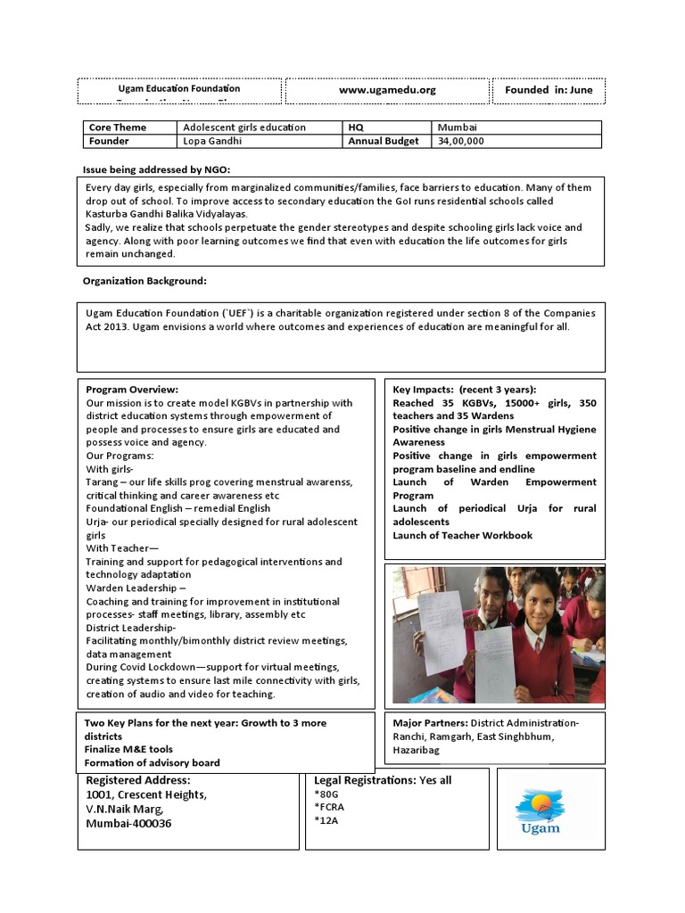 Ugam Education Foundation (`UEF`) is a charitable organization registered under section 8 of the Companies