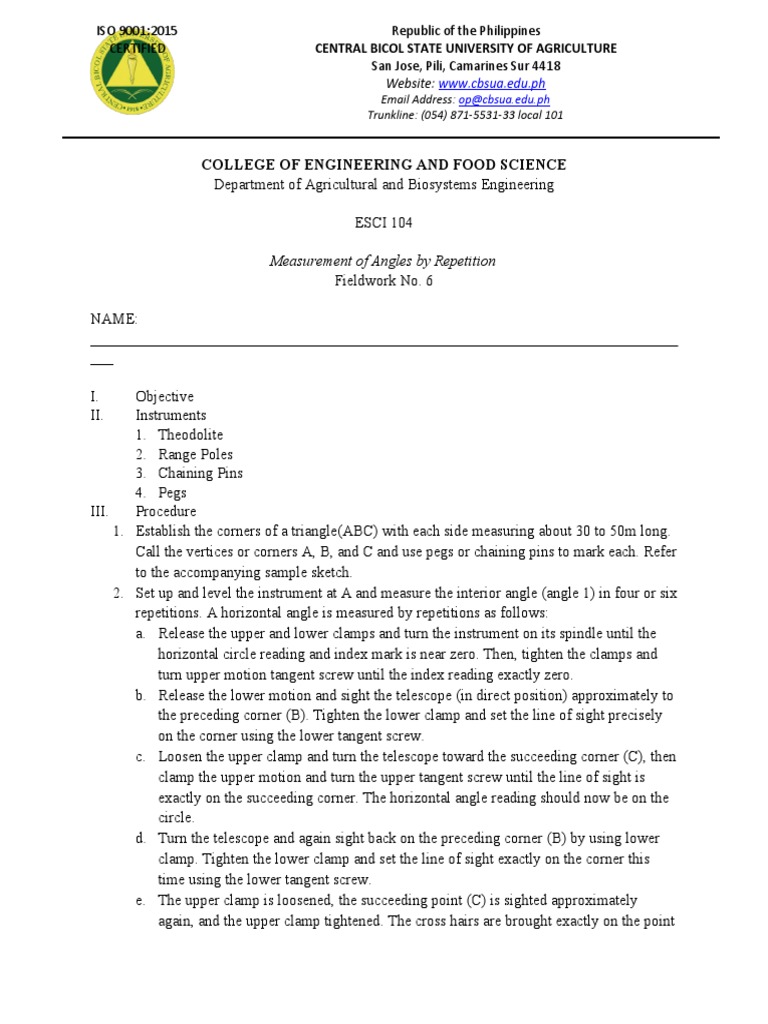 2. Set up and level the instrument at A and measure the interior angle (angle 1) in four or six