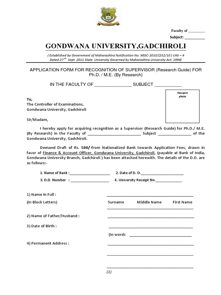 APPLICATION FORM FOR RECOGNITION OF SUPERVISOR (Research Guide) FOR