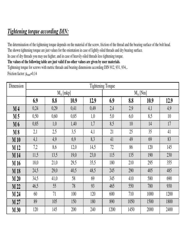 Tightening torque for screws with metric threads and bearing dimensions according DIN 912, 931, 934,..