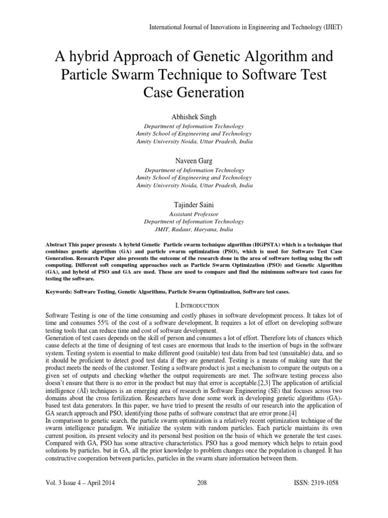 Keywords: Software Testing, Genetic Algorithms, Particle Swarm Optimization, Software test cases.