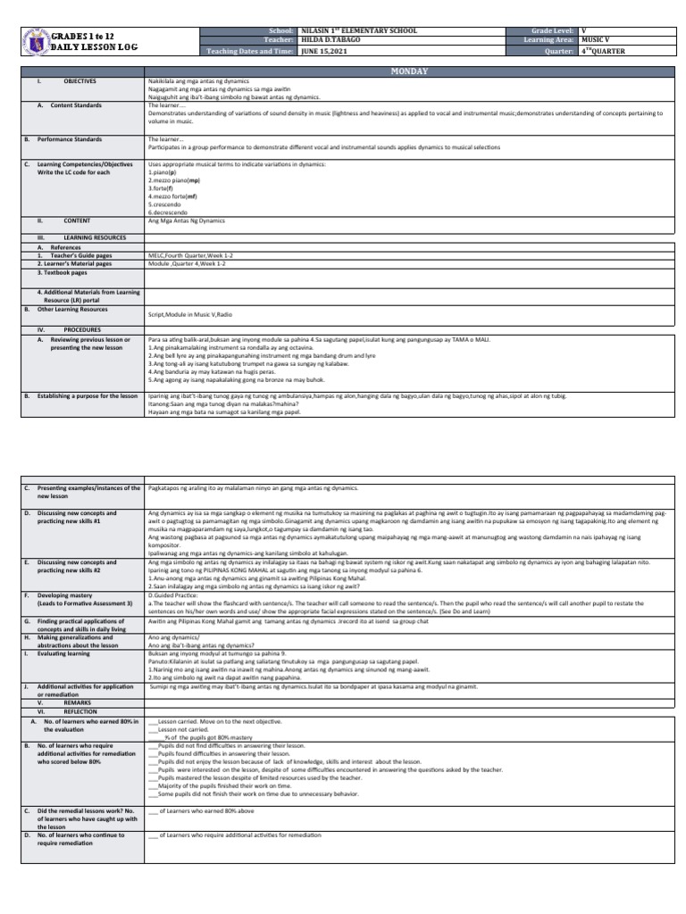 GRADES 1 to 12 Teacher: HILDA [Link] Learning Area: MUSIC V