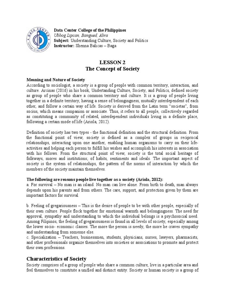 culture. Arcinas (2016) in his book, Undertanding Culture, Society, and Politics, defined society