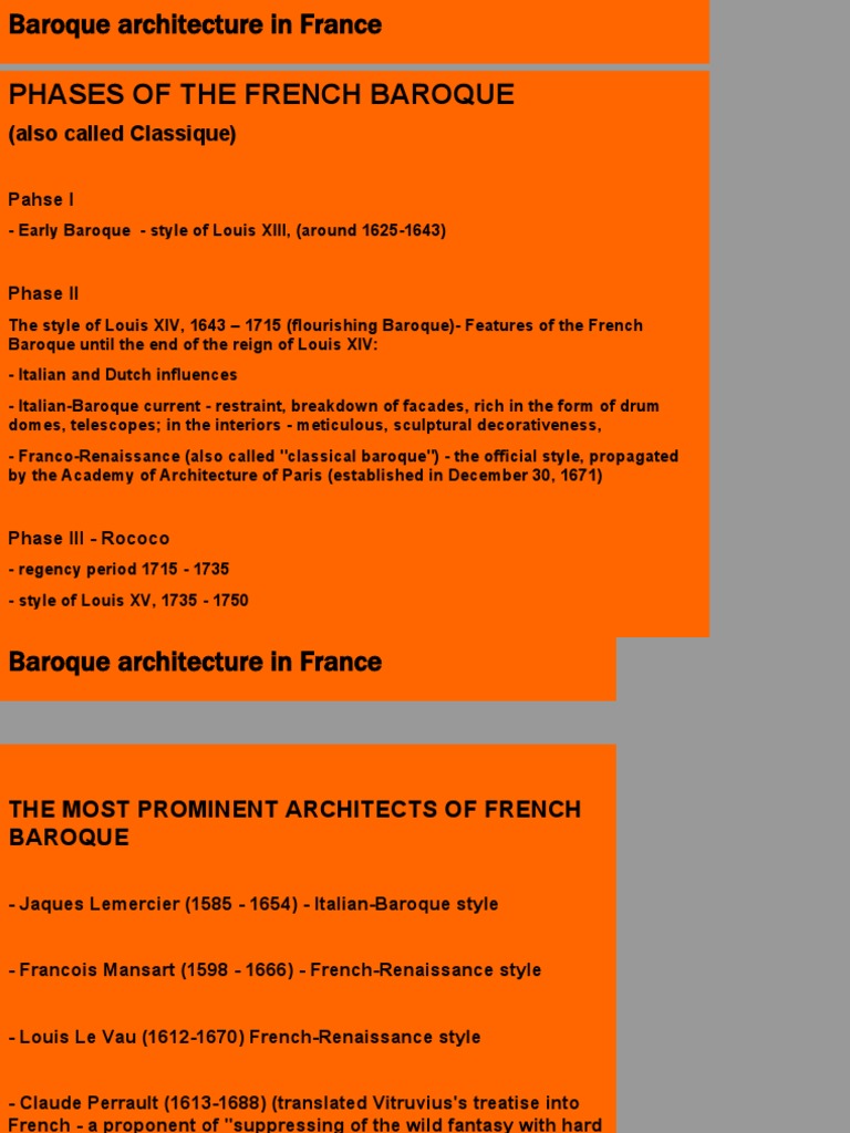 - Franco-Renaissance (also called "classical baroque") - the official style, propagated