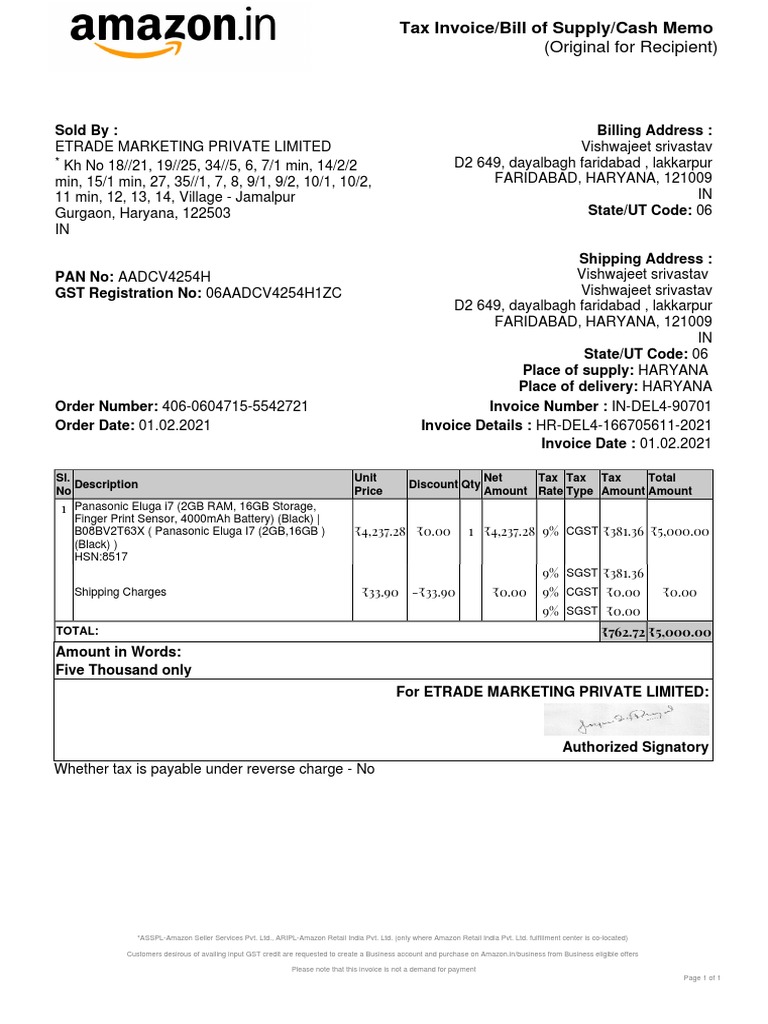 B08BV2T63X ( Panasonic Eluga I7 (2GB,16GB ) ₹4,237.28 ₹0.00 1 ₹4,237.28 9% CGST ₹381.36 ₹5,000.00