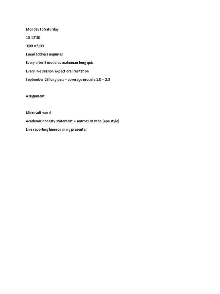 The document provides a schedule and information about assignments. It lists times and days for sessions, times for a long quiz covering certain modules, and expectations for assignments including using Microsoft Word, citations, and live presentations.
