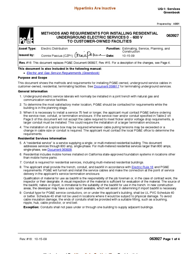 This document shows the methods and requirements for installing PG&E-owned, underground service cables in