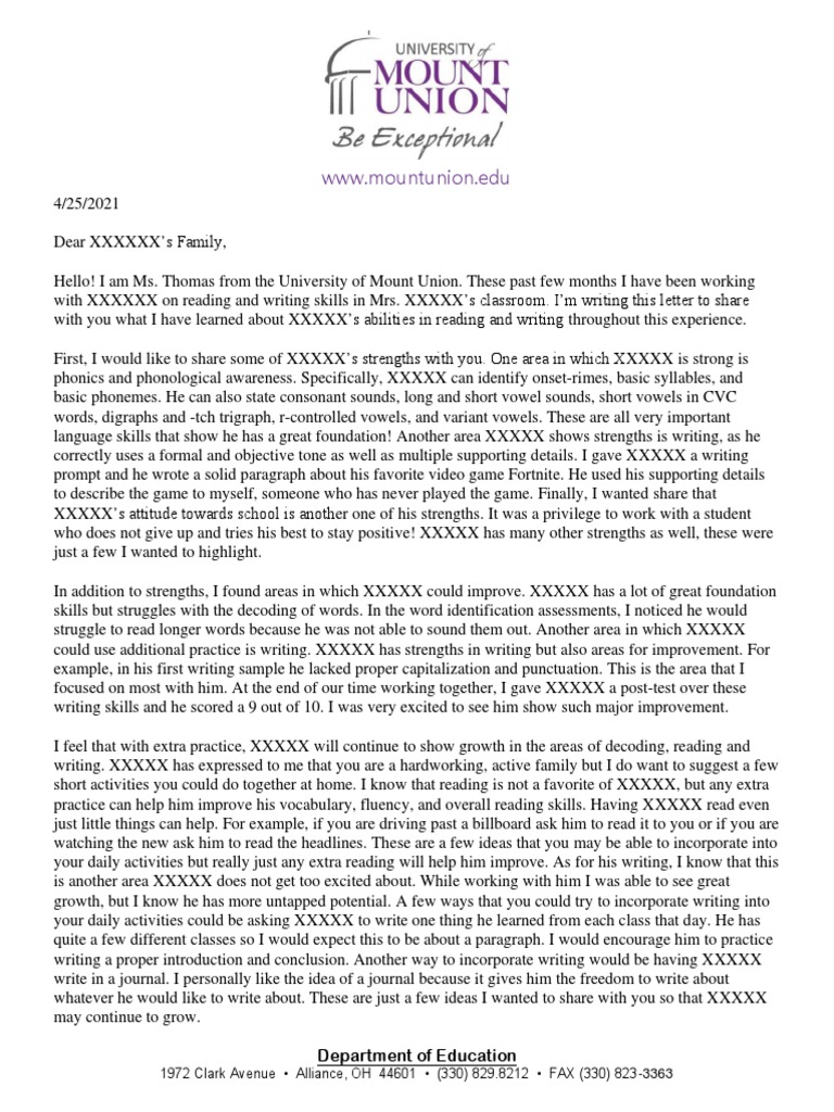 with XXXXXX on reading and writing skills in Mrs. XXXXX’s classroom. I’m writing this letter to share