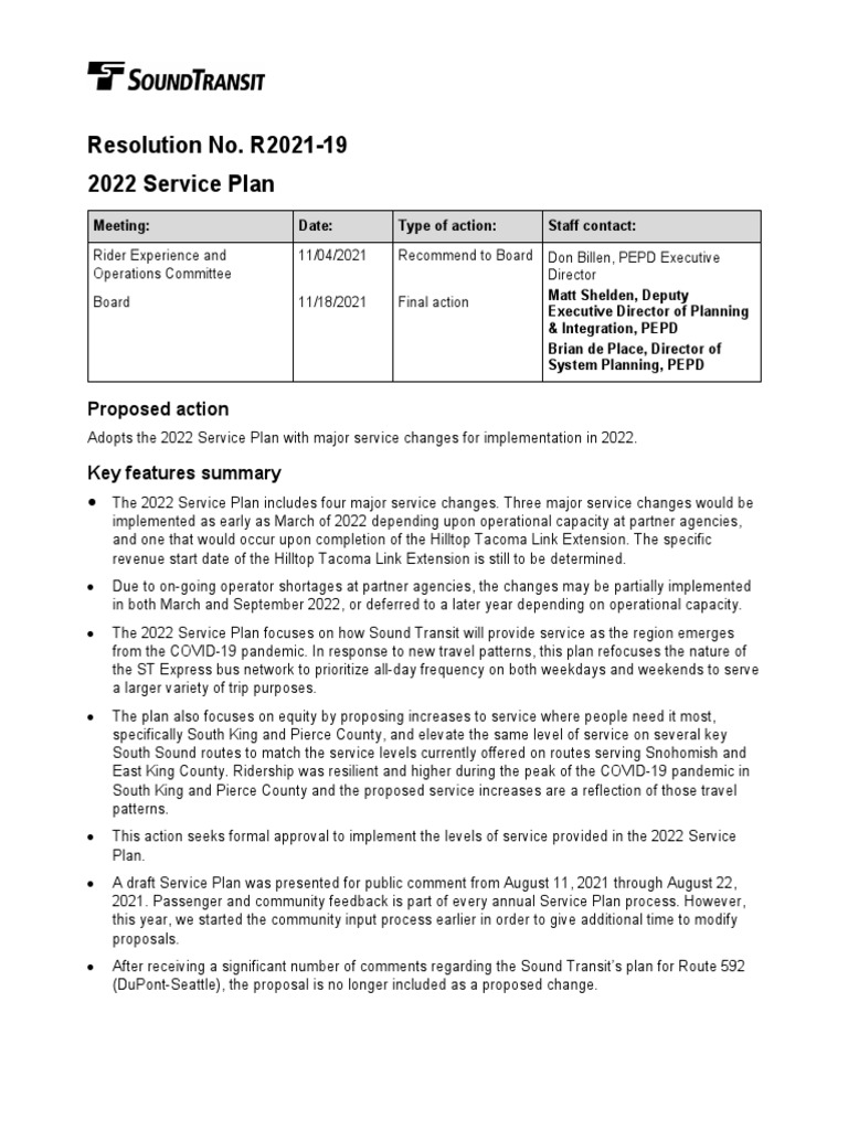 The 2022 Service Plan includes four major service changes. Three major service changes would be implemented as early as March of 2022 depending upon operational capacity at partner agencies, and one that would occur upon completion of the Hilltop Tacoma Link Extension. The specific revenue start date of the Hilltop Tacoma Link Extension is still to be determined.
