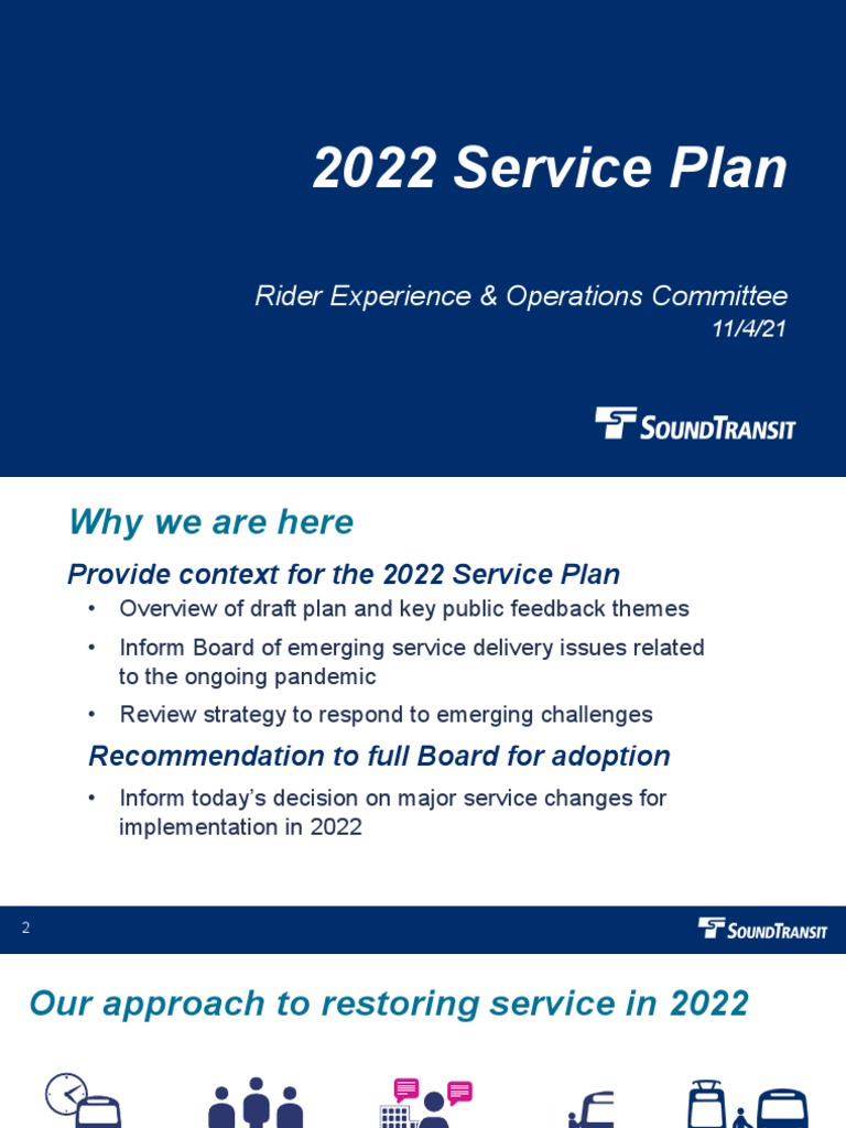 •Overview of draft plan and key public feedback themes•Inform Board of emerging service delivery issues related to the ongoing pandemic•Review strategy to respond to emerging challenges