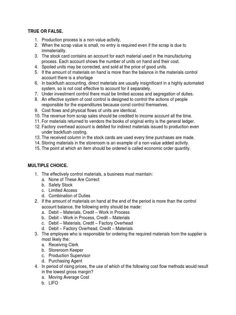 14. Storing materials in the storeroom is an example of a non-value added activity.