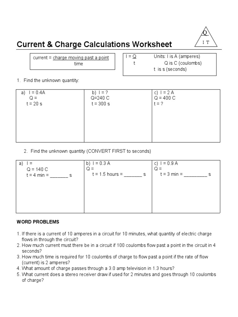 1. If there is a current of 10 amperes in a circuit for 10 minutes, what quantity of electric charge