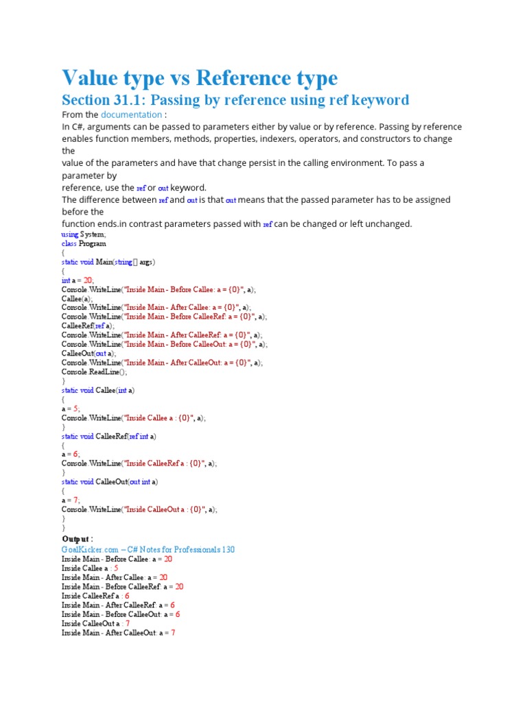 There are two possible ways to pass a value type by reference: ref and out. The difference is that by