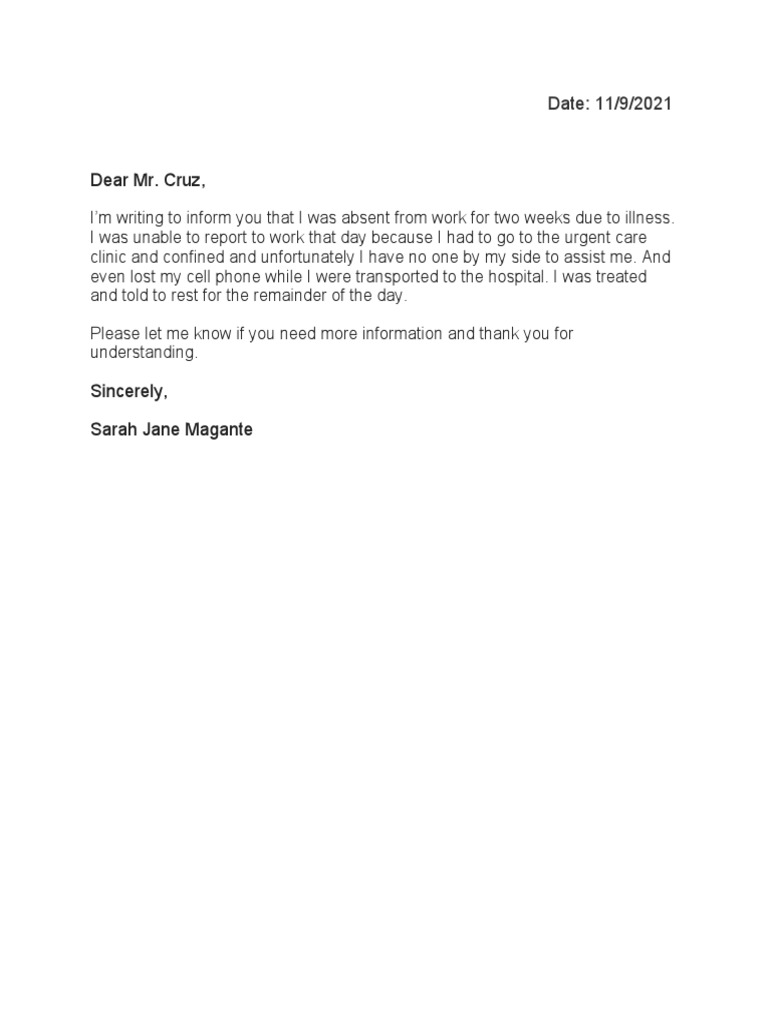 I’m writing to inform you that I was absent from work for two weeks due to illness.