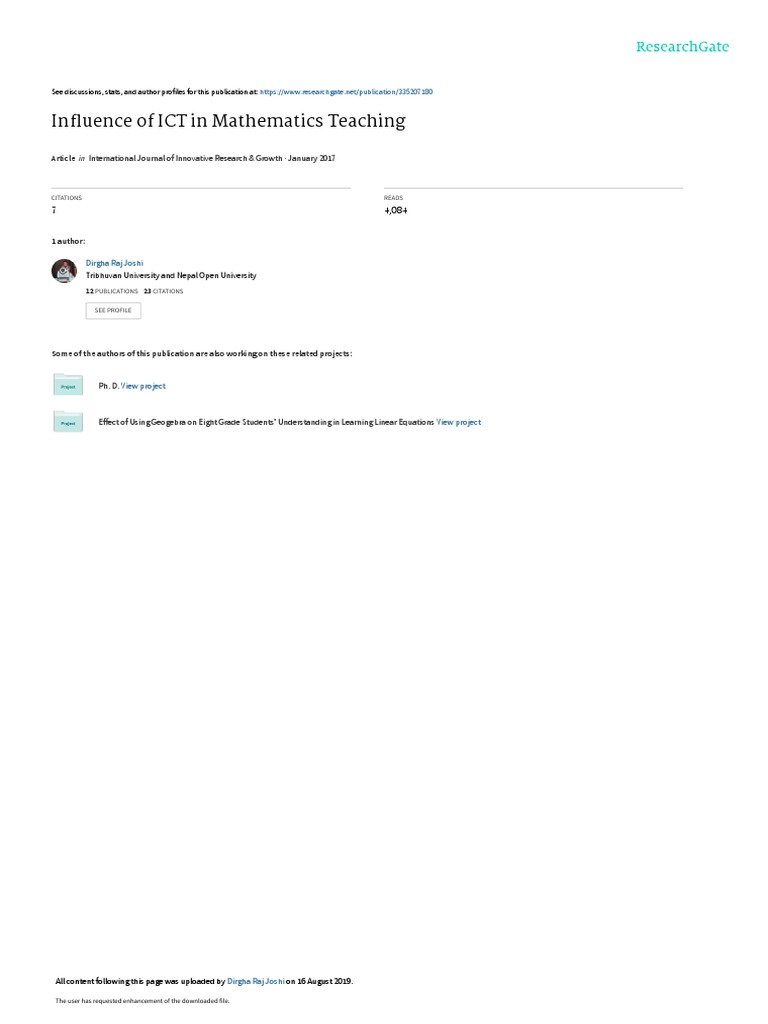 is still marginally integrated into education at all levels (Lavicza, 2008). ICT helps to teach mathematical facts, skills,