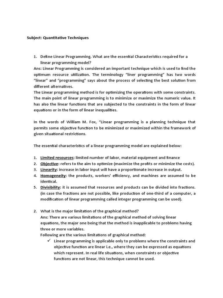 1. Define Linear Programming. What are the essential Characteristics required for a