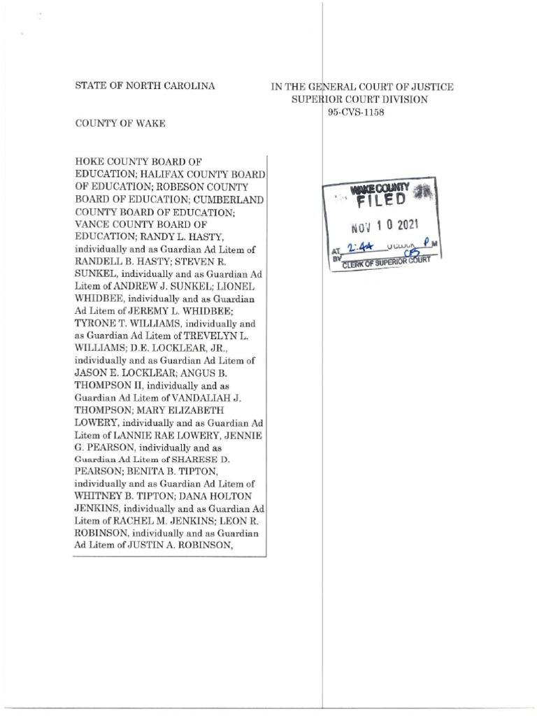 Order issued Nov. 10, 2021 by Superior Court Judge David Lee directing the state of North Carolina to transfer $1.7 billion to increase funding for public education.