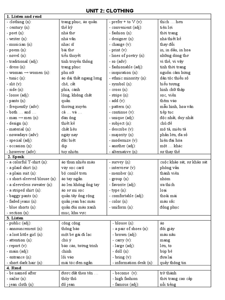 - clothing (n): trang phục, áo quần - prefer + to V (v): thích … hơn