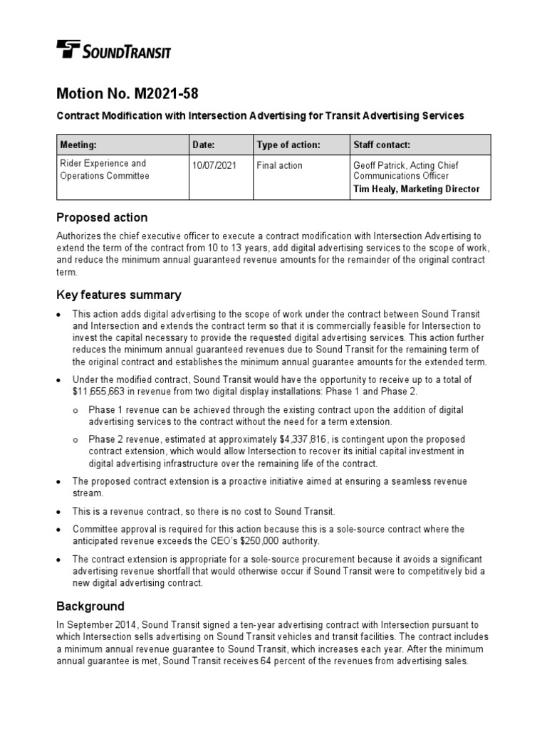 The contract amendment would reduce the minimum annual revenue guarantee from $1.725 million to $1 million for year 8 of the contract, October 2021 to September 2022, from $1.75 million to $1.4 million for year 9, and from $1.775 million to $1.7 million for year 10 to account for reduced revenue resulting from the COVID-19 pandemic. The minimum annual revenue guarantee would then increase by $50,000 per year during the three-year term extension. The contract also includes an option for digital advertising services, which option Sound Transit now desires to exercise. In order to provide digital advertising to Sound Transit, Intersection must make an initial investment in digital advertising infrastructure on Sound Transit’s facilities. A three-year contract extension is necessary to allow Intersection to recoup its capital costs associated with Phase 2 of this investment which, in turn, is necessary to make the installation of digital advertising infrastructure for Phase 2 commercially feasible. The extension will, in turn, allow Sound Transit to generate an additional $4,337,816 in revenue. Because this is a sole-source extension of the original contract for which anticipated revenue would exceed the CEO’s authority, Committee approval is required.
