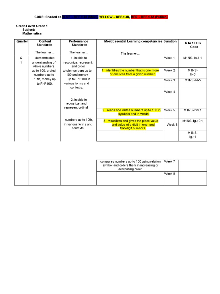 Quarter Content Standards Performance Most Essential Learning Duration