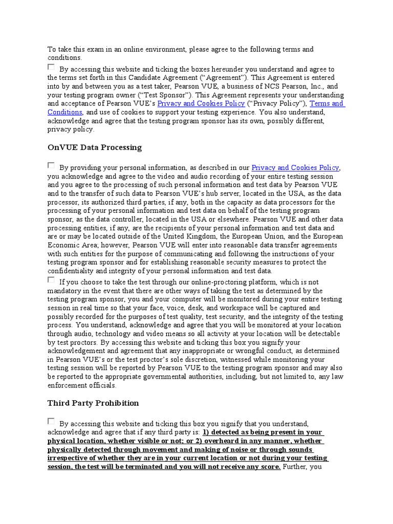 and acceptance of Pearson VUE’s Privacy and Cookies Policy (“Privacy Policy”), Terms and