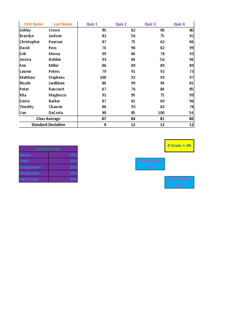 First Name Last Name Quiz 1 Quiz 2 Quiz 3 Quiz 4
