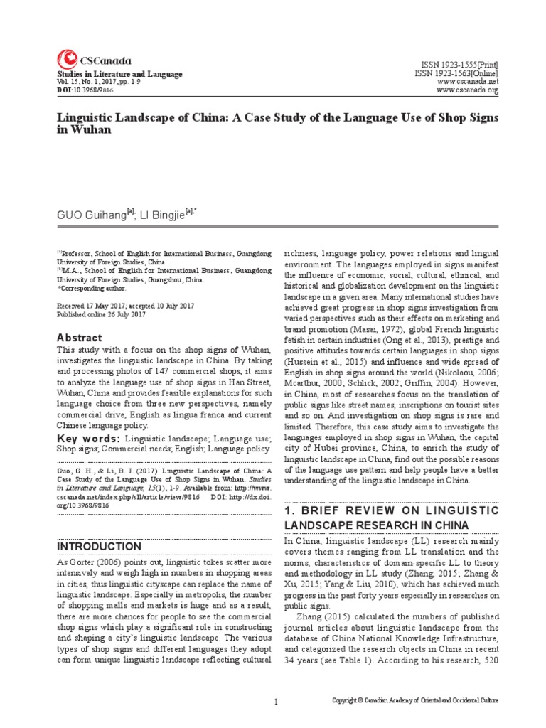 Guo, G. H., & Li, B. J. (2017). Linguistic Landscape of China: A of the language use pattern and help people have a better